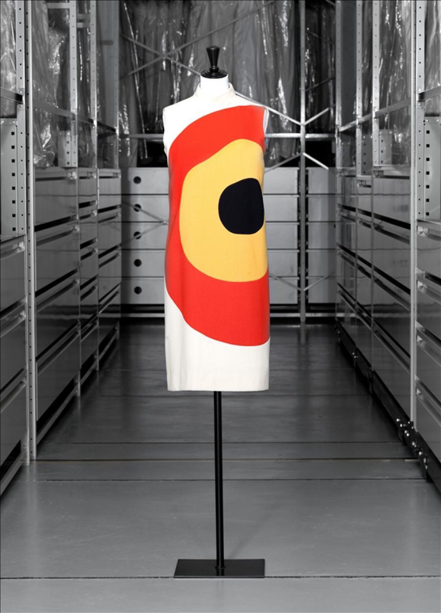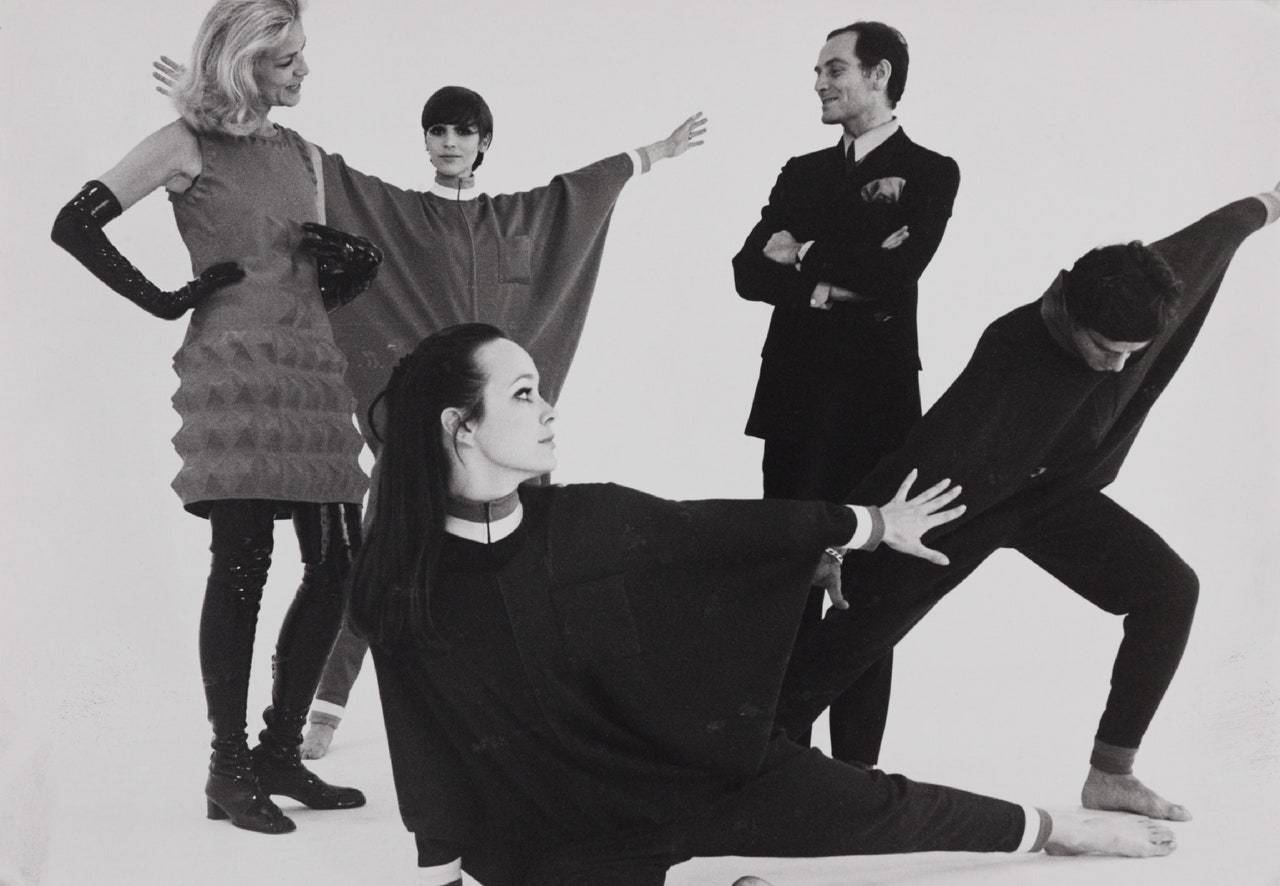 恰巧在这个时间点,面料科技进一步发展,好多之前没有的化学合成面料被开发出来。这些见都没有见过的神奇面料,没有了过去高级时装的娇贵,却给时装造型带来了更大的空间。这些面料到了皮尔卡丹手上,他怎么可能会放过。他把这些面料裁成各种各样奇怪的形状,然后在穿在模特身上。